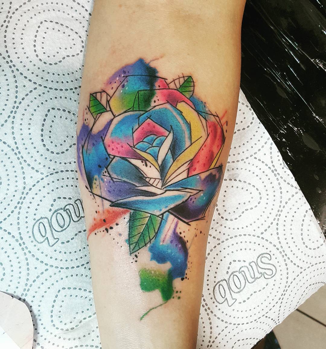 重庆爱加欧郡做舞蹈教练的凌先生小臂水彩玫瑰纹身图案